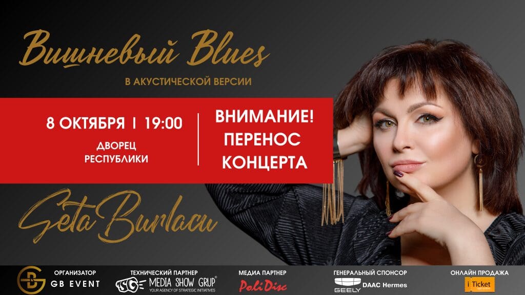 В связи с неблагоприятными погодными условиями и заботой о зрителях концерт Джеты Бурлаку «Вишневый блюз», который должен был состояться 1 октября в Музее Этнографии, переносится. Концерт состоится 8 октября 19:00 во Дворец Республики (Palatul Republicii). Билеты, приобретенные ранее, остаются действительными. В программу войдут как песни из нового, долгожданного альбома, так и уже полюбившиеся слушателям хиты […]