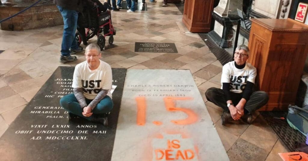 Две активистки движения Just Stop Oil расписали оранжевой краской могильную плиту Чарльза Дарвина в Вестминстерском аббатстве. 66-летняя Элисон Ли и 77-летняя Ди Блай оставили надпись: «1.5 is dead». Их послание является отсылкой к тому факту, что в 2024 году впервые был превышен важный температурный порог, который сигнализирует о быстром глобальном потеплении. «Мы сделали это, потому что […]