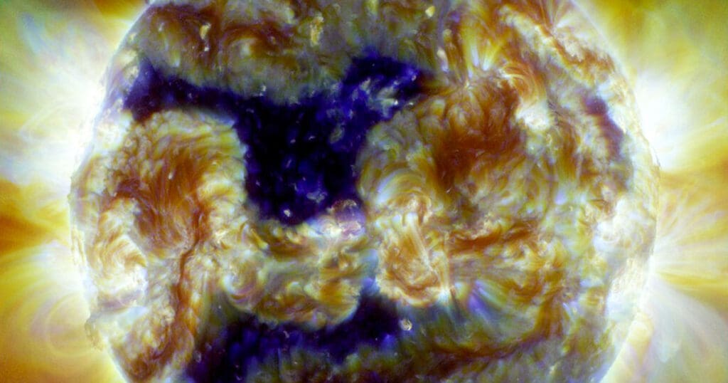 На обращенной к Земле поверхности Солнца разверзлась корональная дыра колоссальных масштабов. Ее ширина составила около 800 тыс. километров, что в 62 раза превышает диаметр нашей планеты. Корональные дыры представляют собой области, где магнитные поля звезды выпускают солнечный ветер в космос. Эти регионы выглядят темнее на ультрафиолетовых снимках, потому что горячие, светящиеся газы, обычно заключенные в […]