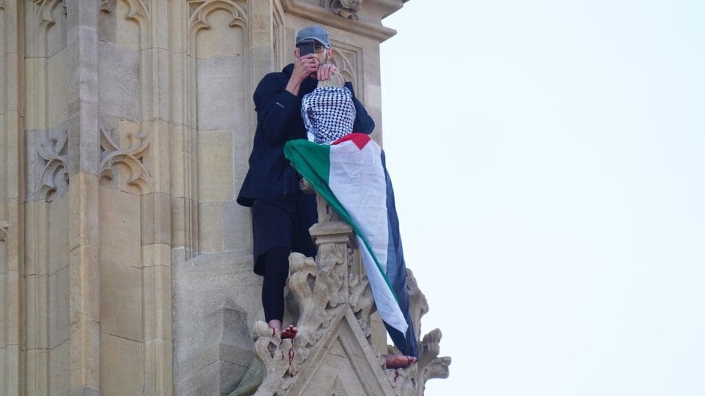 Босой мужчина с палестинским флагом забрался на башню Биг-Бена