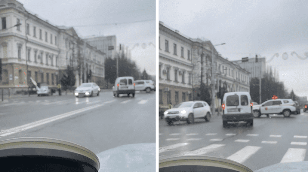 (ВИДЕО) В центре Кишинева водитель сбил дорожный знак