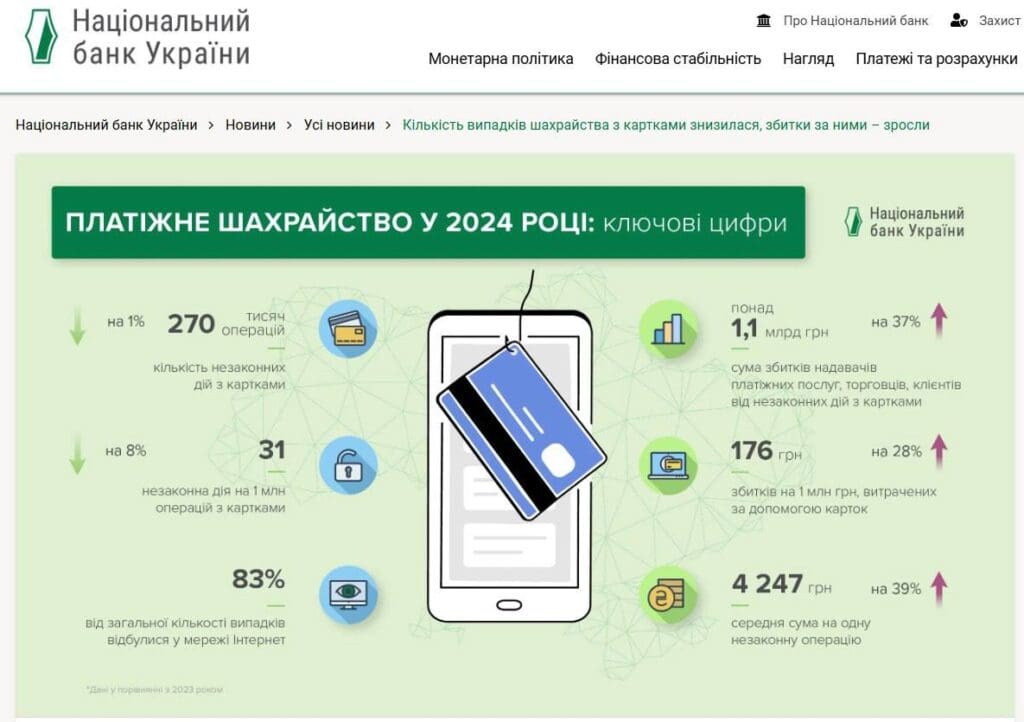 Национальный банк Украины (НБУ) сообщил, что за 2024 год с карточных счетов граждан было похищено 1,1 млрд гривен, на 37% больше, чем в 2023. Средняя сумма, которую теряла каждая жертва, выросла с 3,1 тыс. до 4,8 тыс. гривен. Увеличение связано не только с ростом активности мошенников, но и увеличением объема карточных транзакций: на 8%. По […]