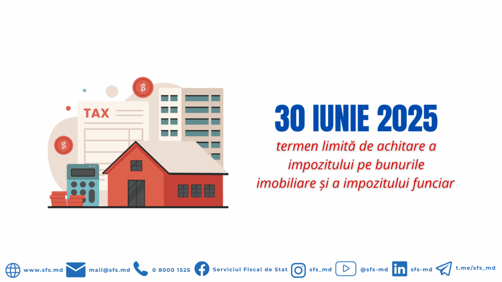 Государственная налоговая служба (ГНС) Молдовы напоминает, что 30 июня истекает срок уплаты налога на недвижимое имущество и земельного налога за текущий год. Обязанность касается граждан и крестьянских (фермерских) хозяйств, владеющих или приобретших имущество до 31 марта 2025 года включительно. Сумма налога на недвижимое имущество и земельного налога ежегодно рассчитывается службами по сбору местных налогов и […]