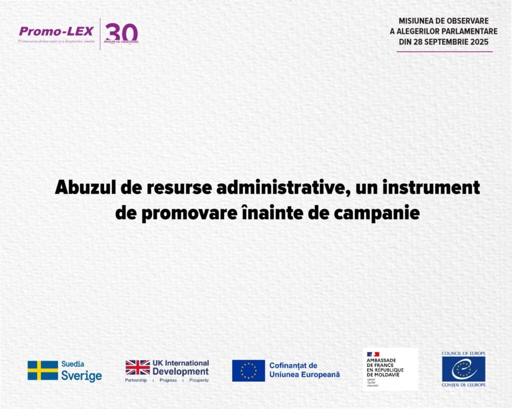 Ассоциация Promo-LEX обращает внимание на системное явление: злоупотребление административными ресурсами, которое по-прежнему допускается и практикуется. Будь то «стратегические» бюджетные распределения, завуалированные правительственные кампании или политическое продвижение с использованием государственных учреждений результат один и тот же: нарушение равенства возможностей политических формирований в избирательном контексте, подрыв общественного доверия и, соответственно, искажение избирательного процесса. Что представляет собой злоупотребление […]