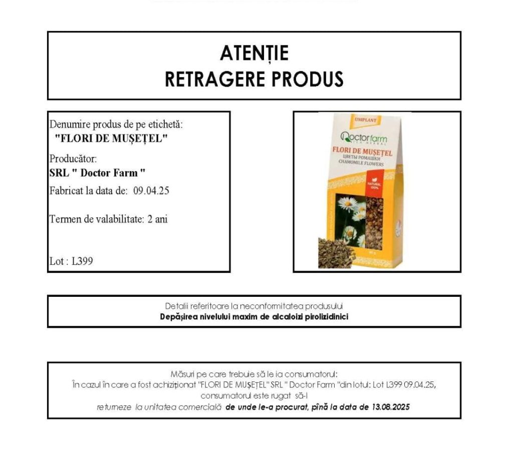 Национальное агентство по безопасности пищевых продуктов (ANSA) объявило сегодня, 1 августа, об отзыве из торговой сети и у потребителей партии сушёных цветков ромашки, произведённых компанией SRL «Doctor Farm». Причина — превышение допустимого уровня пирролизидиновых алкалоидов, способных нанести вред здоровью. Речь идёт о партии № L399, изготовленной 9 апреля 2025 года. Продукт продавался в магазинах сетей […]
