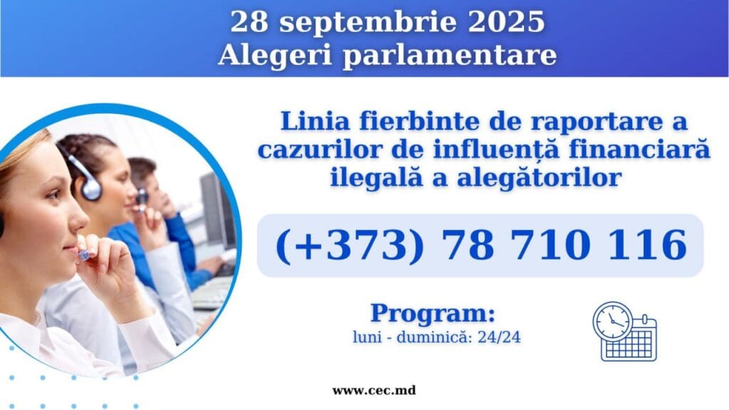 Граждане Молдовы, которые находятся на территории страны, а также за рубежом, смогут сообщить о случаях избирательной коррупции, позвонив на горячую линию Национального центра по борьбе с коррупцией: +373 78 710 116. Центральная избирательная комиссия уточняет, что линия доступна круглосуточно, а сообщения можно отправлять в аудио- и видеоформатах, SMS или мессенджеры: Viber, WhatsApp и Telegram. Власти […]