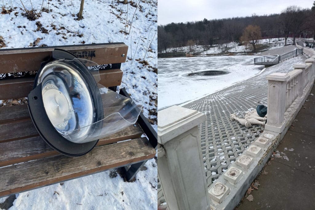 В парке на Рышкановке вандалы разбили фонари и повредили забор: полиция ищет нарушетелей по камерам видеонаблюдения