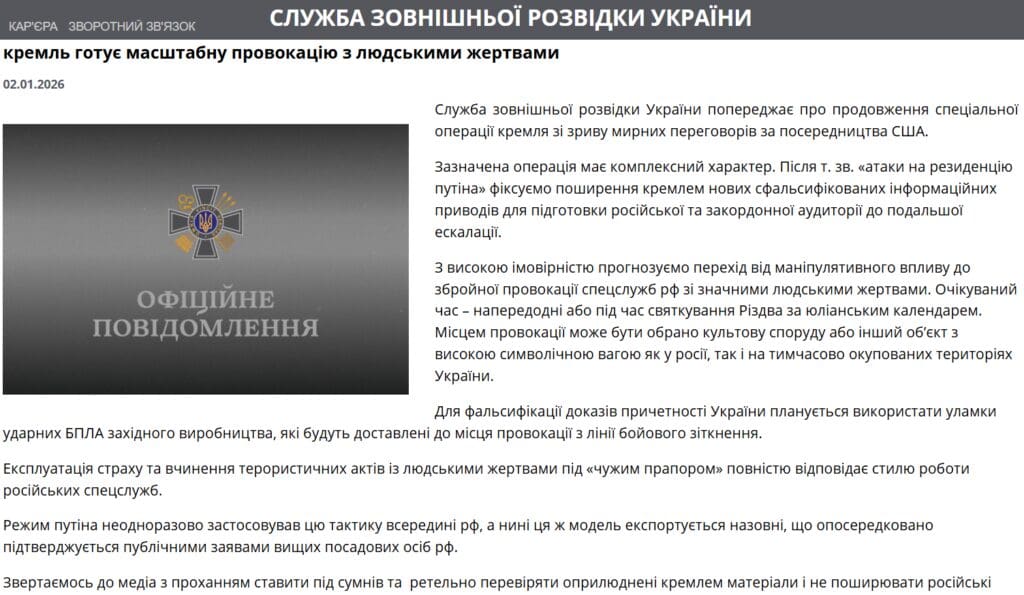 Служба Внешней Разведки Украины: Россия на Рождество готовит провокацию на своей территории с целью срыва переговоров