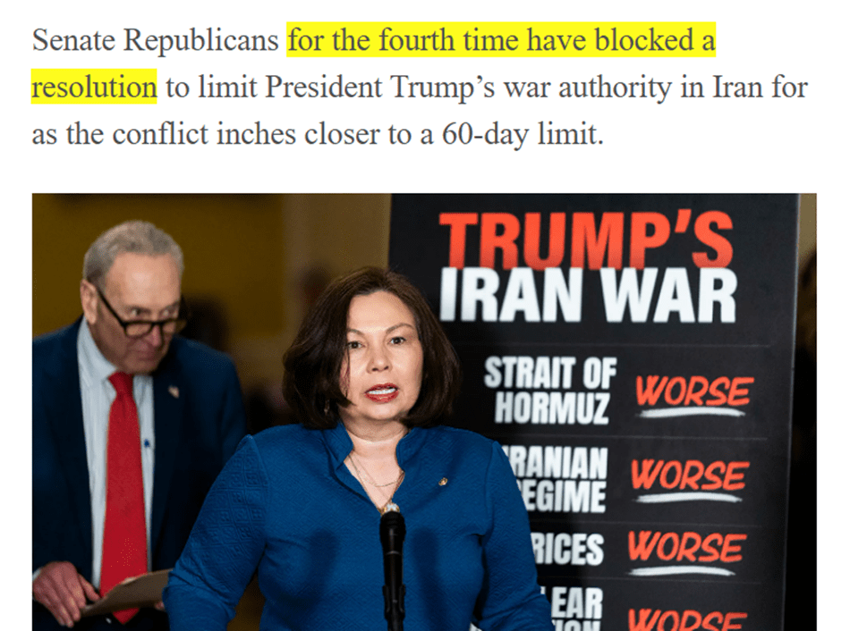 Сенат США в четвёртый раз отклонил резолюцию, направленную на ограничение полномочий президента Дональда Трампа в отношении военных действий против Ирана. Об этом сообщает The Hill. Голосование прошло на фоне приближения 60-дневного срока, установленного законом о военных полномочиях, в течение которого Конгресс должен одобрить или ограничить продолжение военной операции. Инициатором резолюции выступила сенатор-демократ Тэмми Дакворт. Она […]