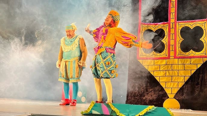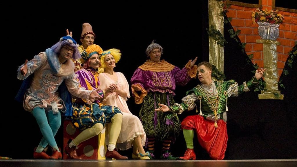 Комедийная версия «Ромео и Джульетты» создана с размахом и от души. На сцене замок и знаменитый балкон Джульетты, надувной домик Капулетти, поролоновые кусты и аптекарь со смертельным реквизитом. Яркие костюмы и маски (да, самые настоящие маски – именно они, стуча в колотушки, начинают представление, оповещая публику, что в Вероне якобы все спокойно!) напоминают нам о классической комедии дель арте.