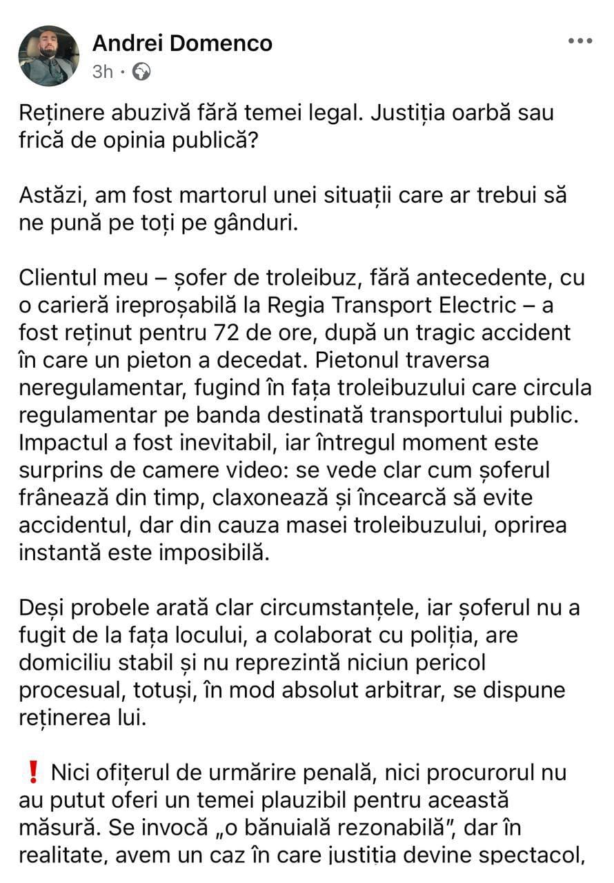 В открытом посте в социальной сети адвокат выразил возмущение действиями полиции и прокуратуры. По его словам, водитель троллейбуса — человек с безупречной репутацией и без судимостей, многолетний работник Regia Transport Electric. Он подчеркнул, что клиент не скрывался с места происшествия и активно сотрудничал со следствием.