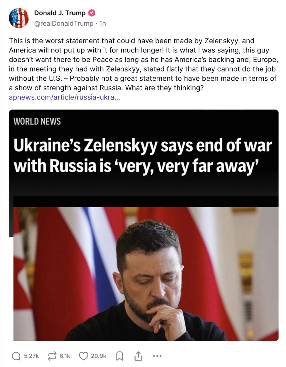 «Это худшее заявление, которое мог сделать Зеленский, и Америка больше не будет с этим мириться! Это то, что и я говорил: этот парень не хочет, чтобы был мир, пока у него есть американская опора. И Европа, на встрече, которую они провели с Зеленским, прямо заявила, что они не могут выполнять эту работу без США — вероятно, это не очень хорошее заявление, которое было сделано с точки зрения проявления силы против России. О чем они думают? — написал Трамп в соцсети Truth social.