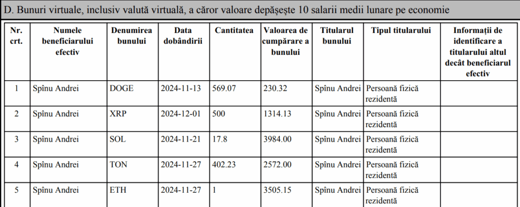 Согласно его декларации о доходах за 2024 год, Спыну владеет следующими виртуальными валютами: