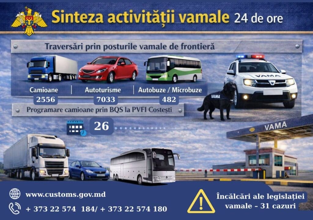 За 24 часа таможенные посты Молдовы зафиксировали более 10 тысяч пересечений транспортных средств. По данным Таможенной службы, через границу прошли тысячи легковых и грузовых автомобилей, а также несколько сотен автобусов и микроавтобусов: • 2556 грузовиков• 7033 легковых автомобиля• 482 автобуса и микроавтобуса В ведомстве также сообщили о загруженности системы предварительного бронирования для грузового транспорта на […]