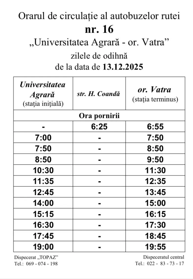 Начиная с субботы, 13 декабря, изменяется расписание пригородного автобусного маршрута № 16, курсирующего от Аграрного университета до города Ватра. Это касается только выходных дней.