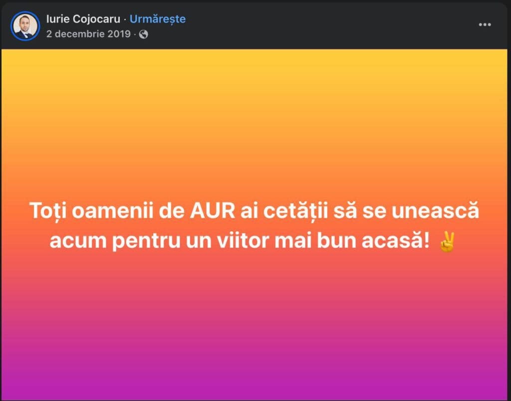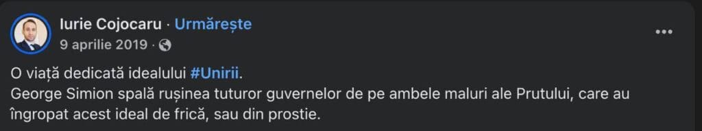 «Почему я на фото с Симионом? Всё просто: я считаю, что Молдова должна когда-нибудь вернуться домой, в Румынию. Проблема не в фотографиях, а в людях, которые разочаровали нас на этих фотографиях, которые нас обманывали, которые пользуются нашим доверием. Я НИКОГДА не подписывал присоединение к AUR. Партия тогда ещё не существовала, а когда Джордже скатился в экстремизм, тогда я сделал 100 шагов назад», — написал Кожокару в соцсетях.