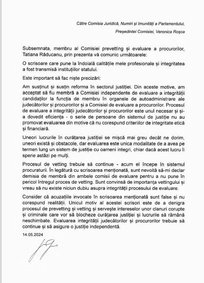 В документе Рэдукану упоминает, что в государственные учреждения поступило письмо, ставящее под сомнение ее профессиональные н и добросовестность.