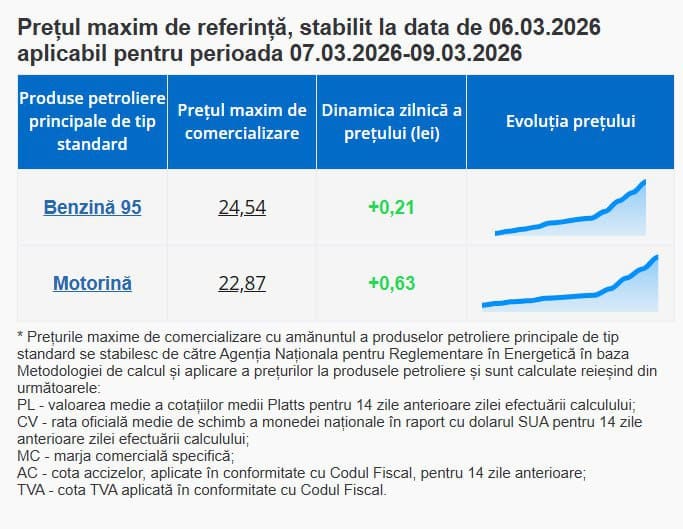 Национальное агентство по регулированию в энергетике (НАРЭ) объявило об очередном скачке цен на топливо: завтра, 7 марта, бензин подорожает на 21 бан, а дизель — сразу на 63 бана. Стоимость литра А95 достигнет 24,54 лея, в то время как солярка поднимется до 22,87 лея.