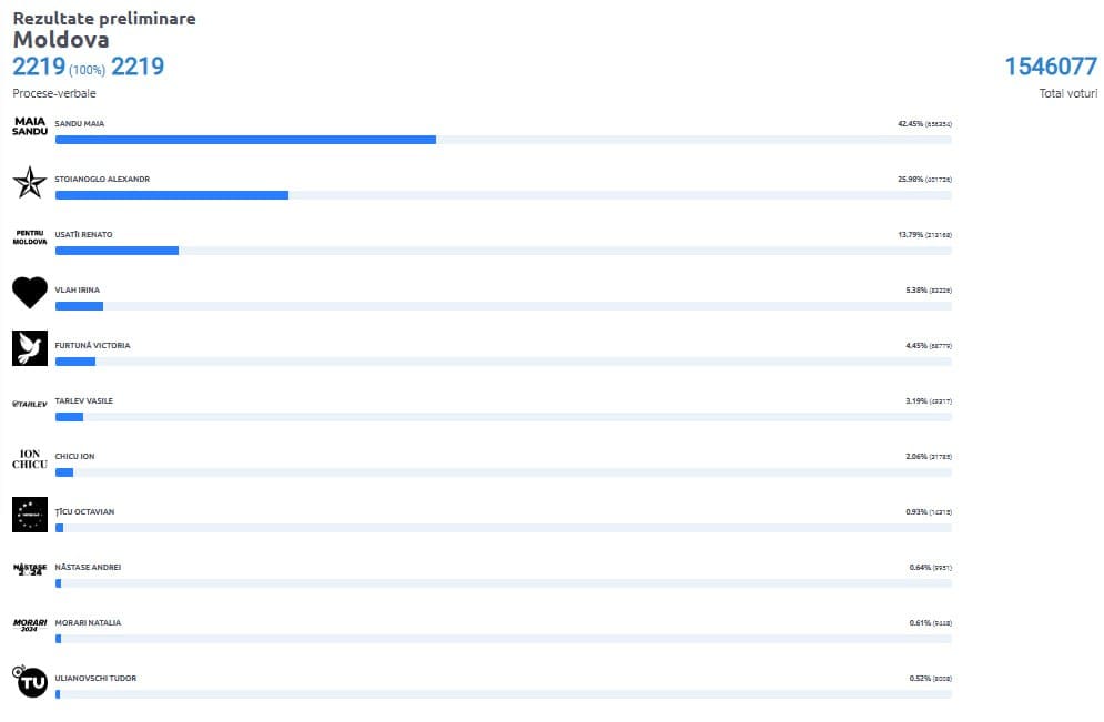 На выборах президента лидирующую позицию занимает действующий президент Майя Санду, с 42,45% голосов избирателей. На втором месте расположился Александр Стояногло — 25,98%.