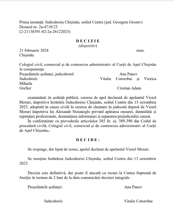 Апелляционная палата Кишинева (АП) оставила в силе решение суда первой инстанции, который отклонил ходатайство бывшего руководителя Антикоррупционной прокуратуры Виорела Мораря к экс-генеральному прокурору Александру Стояногло. Речь идет о действиях по защите чести, достоинства и профессиональной репутации.
