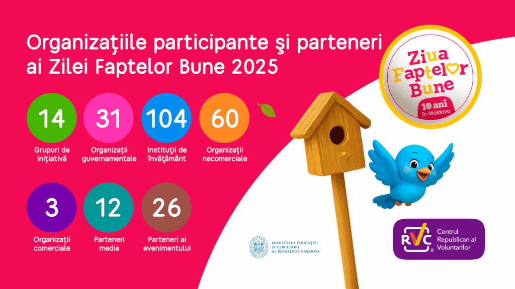 Масштаб Дня Добрых Дел был бы невозможен без наших информационных партнёров и спонсоров. Благодарим Министерство образования и исследований Республики Молдова — стратегического партнера мероприятия, Национальное агентство по делам молодёжи, партнеров в рамках акций JDC Moldova, а также десятки компаний, представителей СМИ и агентств, которые поверили в силу волонтёрства
