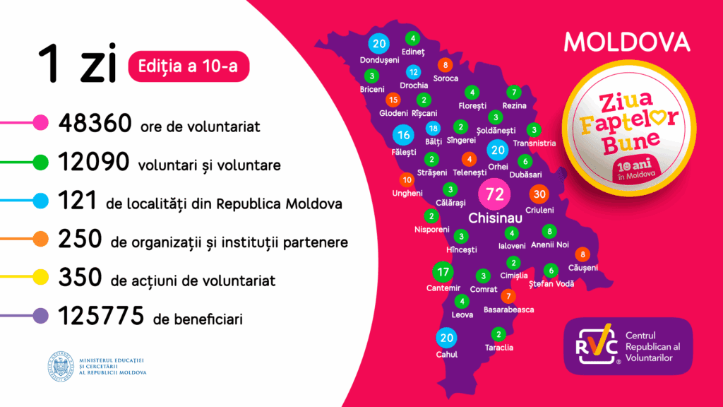 В этом году юбилейное мероприятие стало особенно масштабным: сотни организаций-партнеров, десятки городов и сёл — от Новых Анен до Фалешт, от Комрата до Бельц. Всего лишь за один день 12 090 волонтеров достигли следующих результатов: