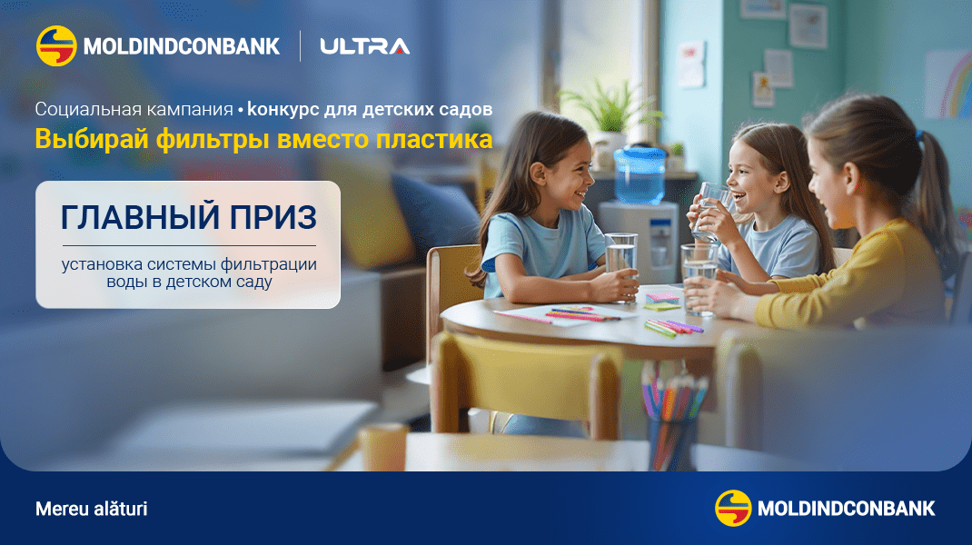 Moldindconbank в партнёрстве с шоурумом электроники и бытовой техники ULTRA запускают вторую волну кампании «Выбирай фильтры вместо пластика» — инициативы, которая продвигает использование фильтрованной воды и помогает сократить потребление одноразового пластика в детских садах Молдовы.