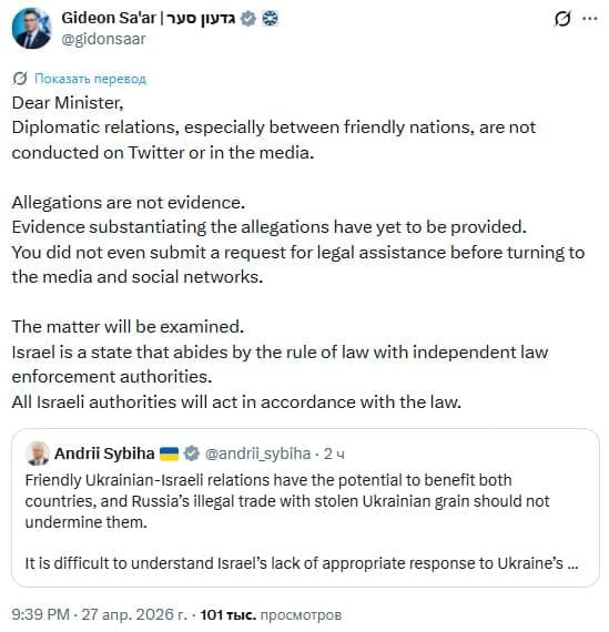 В свою очередь министр иностранных дел Израиля Гидеон Саар отверг обвинения Киева. По его словам, Украина не предоставила доказательств того, что зерно, поступившее в Израиль, происходит с территорий, оккупированных Россией.