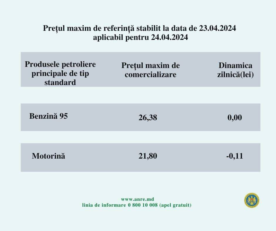 Предельная стоимость бензина составит 26,38 леев, а дизельного топлива – 21,80 леев.