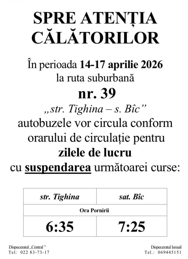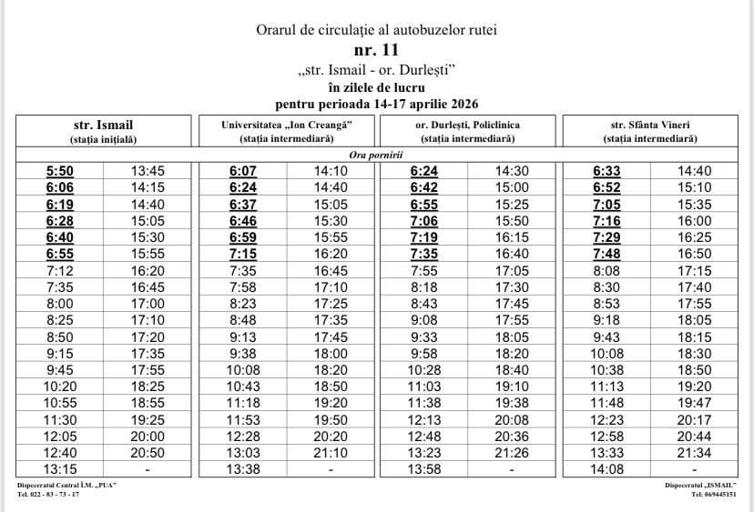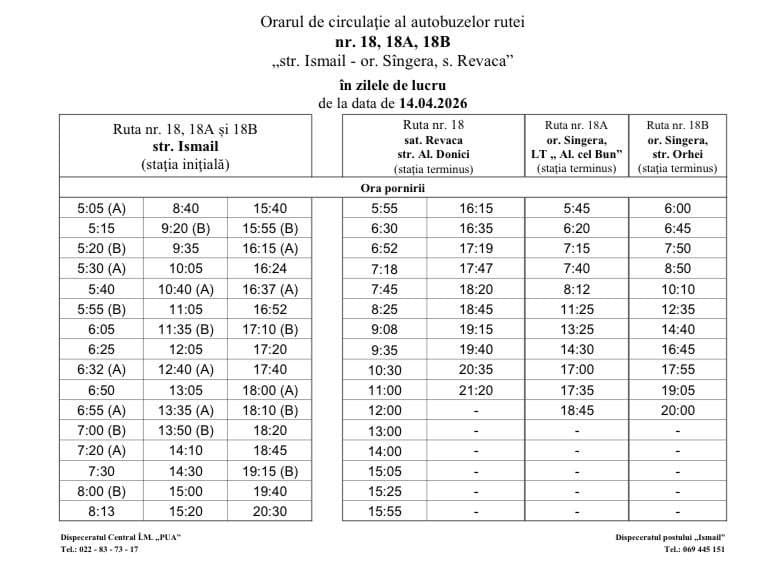 Изменения также коснулись маршрута №11 «ул. Измаил – г. Дурлешты». Кроме того, с 14 апреля скорректированы рейсы маршрутов №18, 18A и 18B, соединяющих Кишинёв, Сынжеру и Реваку.
