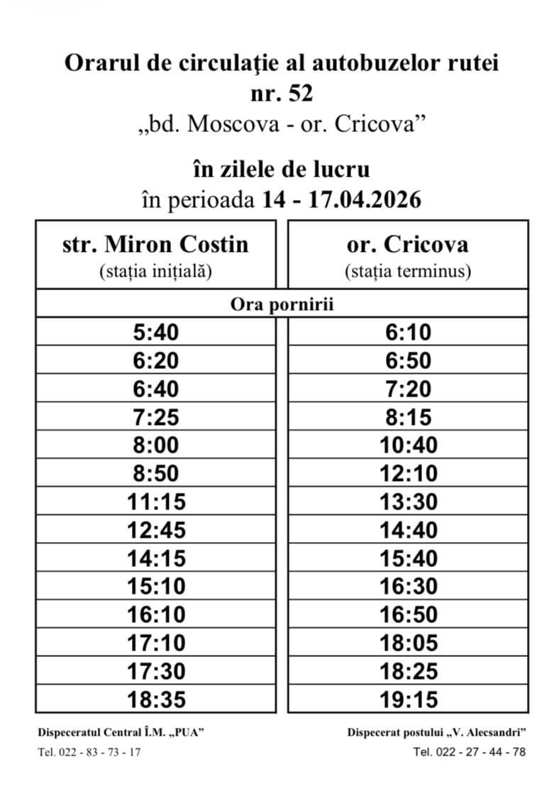 На маршруте №39 «ул. Тигина – с. Бык» будет отменён утренний рейс с отправлением в 6:35 из Кишинёва и в 7:25 из села Бык. Также для маршрута №52 «Московский проспект – г. Крикова» введено изменённое расписание в рабочие дни с регулярными рейсами в течение дня.