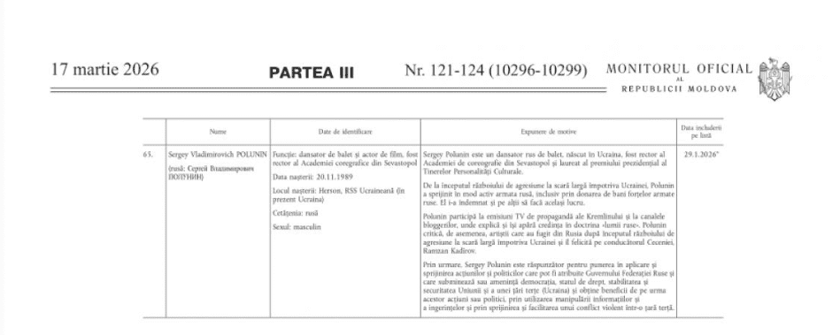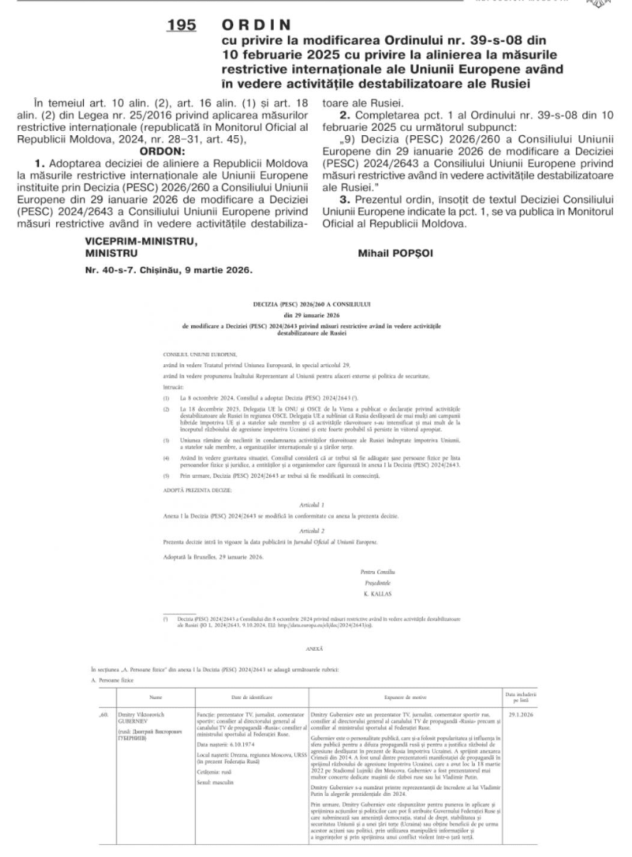 Решение о применении санкций подписал глава МИД Молдовы Михай Попшой. Документ опубликован в «Официальном мониторе» 17 марта 2026 года.