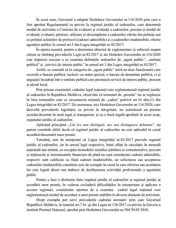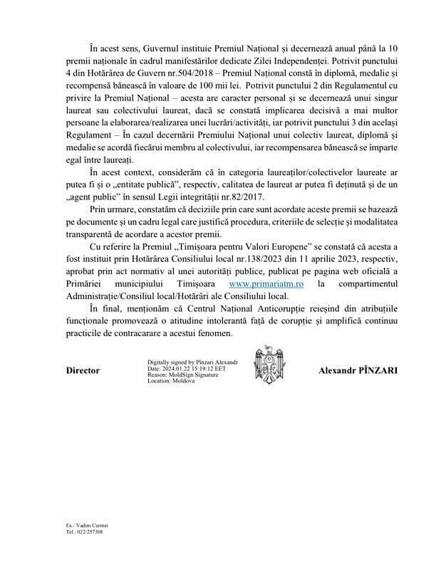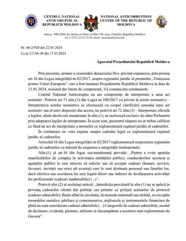 «Национальный центр по борьбе с коррупцией уточнил, что правовой режим подарков не применяется в случае вручения/награждения премиями, учитывая, что термин «премия» не встречается в перечне терминов, ограничивающих понятие «подарок» согласно ст.16 пункт. (1) Закона о неподкупности №82/2017. НЦБК подчеркивает тот факт, что Премия «Тимишоара за европейские ценности» была учреждена Решением местного совета №138/2023, соответственно утверждено нормативным актом государственного органа и опубликовано на странице мэрии», — отмечают в администрации президента.