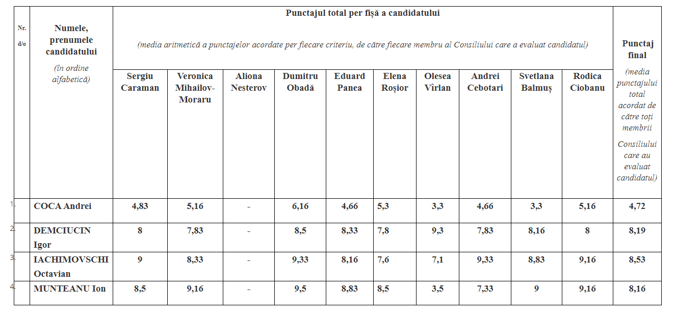 Так, Андрей Кока получил самый высокий балл от председателя ВСП Дмитрия Обадэ — 6,16, а самый низкий — 3,3 — у членов Андрея Чеботаря и Светланы Балмуш. Игорь Демчучин получил высшую оценку 9,3 от Олеси Вырлан, а самую низкую – 7,8 от Елены Рошиор.