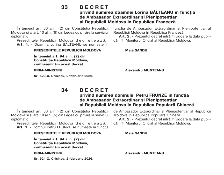 Лорина Бэлтяну назначена послом во Франции, а Петру Фрунзе — в Китае.