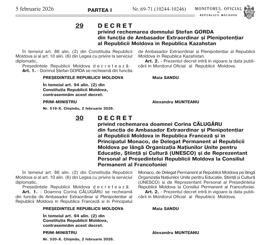 Также опубликованы указы о отзыве Штефана Горды с должности посла в Казахстане и Корины Кэлугэру с должности посла во Франции.