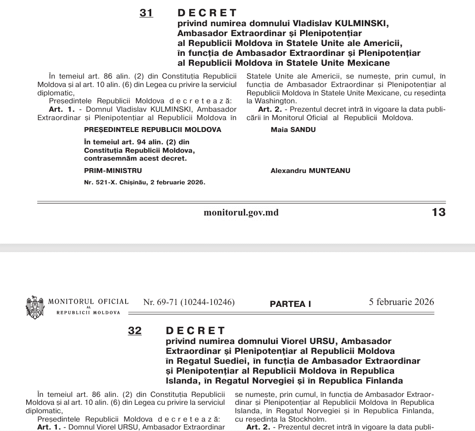 Кроме того, Владислав Кулминский, посол Молдовы в США, теперь также будет послом в Мексике, а Виорел Урсу, посол в Швеции, будет также послом в Исландии, Норвегии и Финляндии.