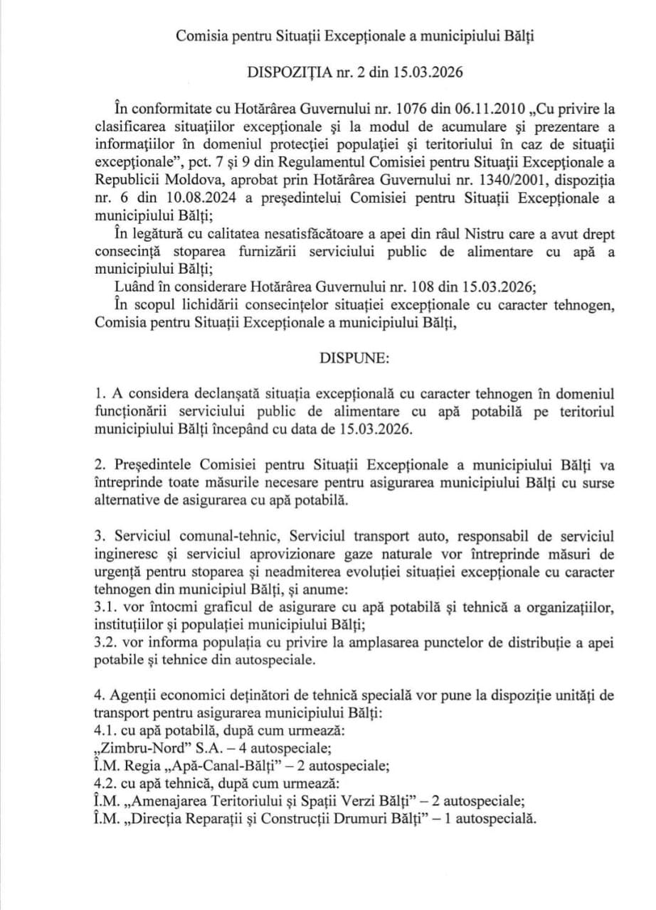 Проблема возникла после того, как была выявлена неудовлетворительная качество воды в Днестре. В результате подача воды в городе была временно остановлена. В связи с этим с 15 марта 2026 года власти объявили чрезвычайную ситуацию техногенного характера в сфере обеспечения питьевой водой.
