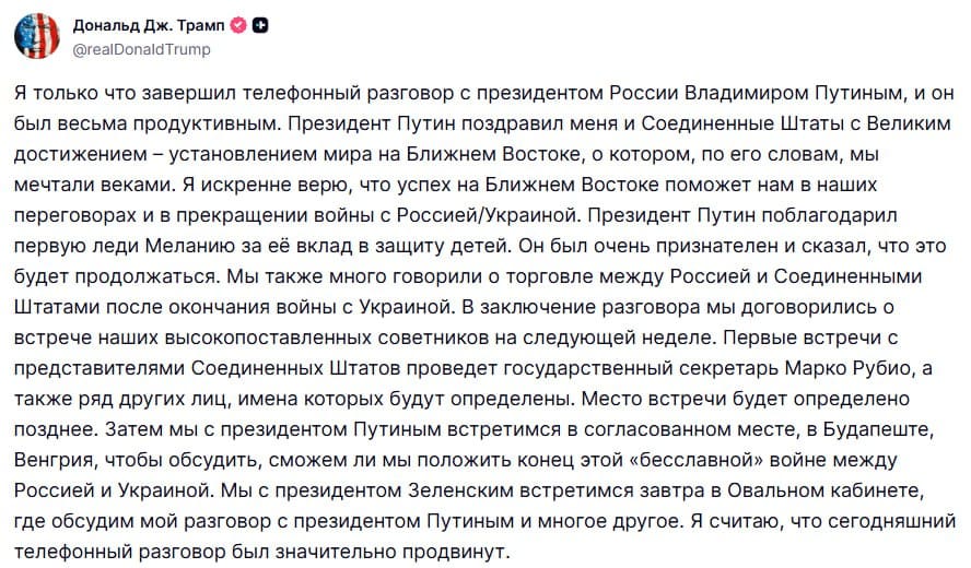 Как написал Дональд Трамп в Truth Social, они с Владимиром Путиным договорились о переговорах российских и американских высокопоставленных чиновников на следующей неделе. Также президенты лично встретятся в Будапеште. Дату проведения переговоров Трамп не уточнил.