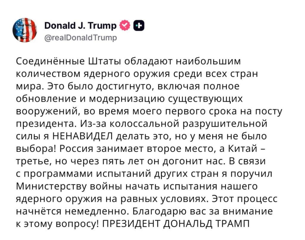 «В связи с тем, что другие страны проводят программы испытаний, я поручил министерству войны начать испытания нашего ядерного оружия на равноправной основе. Этот процесс начнется немедленно», — написал Трамп в соцсетях.