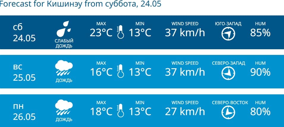 В столице ожидаются осадки. Днем температура воздуха в Кишиневе составит 16 °C, ночью около 13 °C.
