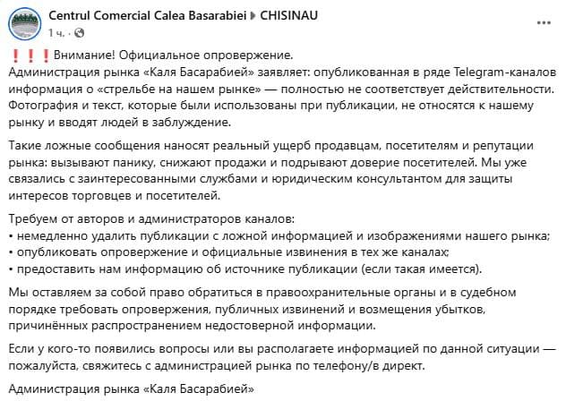 Администрация рынка Каля Бассарабией официально заявляет: информация о «стрельбе на нашем рынке», которая появилась в ряде Telegram-каналов, полностью ложная.