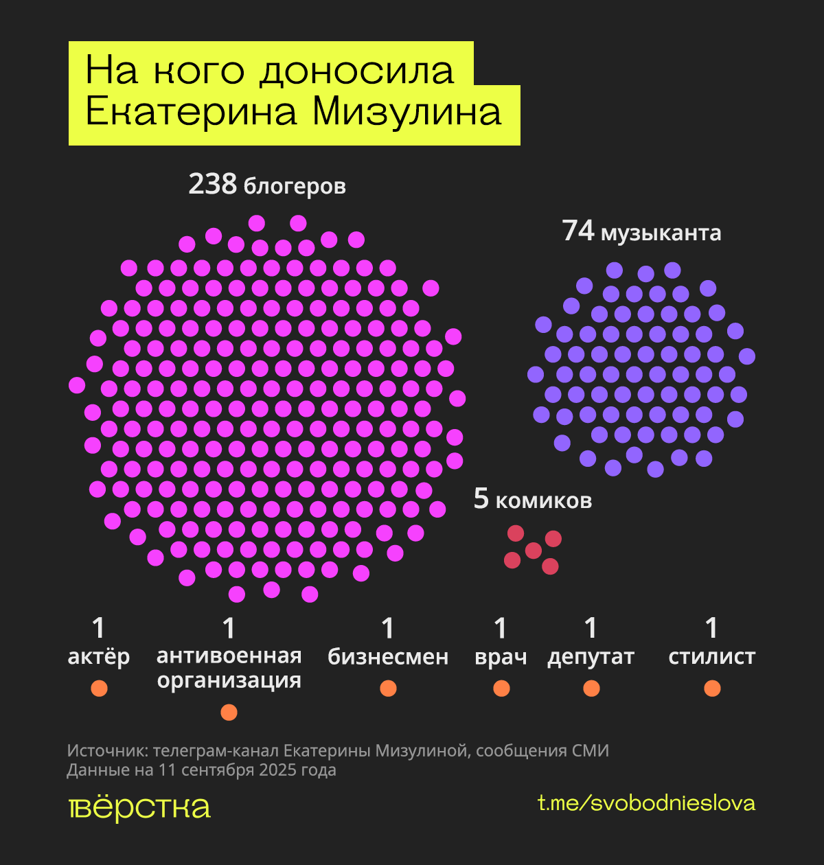 Больше всего Мизулина доносила на блогеров — минимум на 238 человек. Часто её «жертвами» становились трэш-стримеры и инфомошенники — блогеры, рекламирующие онлайн-казино. На последних она во многих случаях писала групповые доносы, публикуя список имён и сообщая, что направила обращения в Роскомнадзор и ФНС.