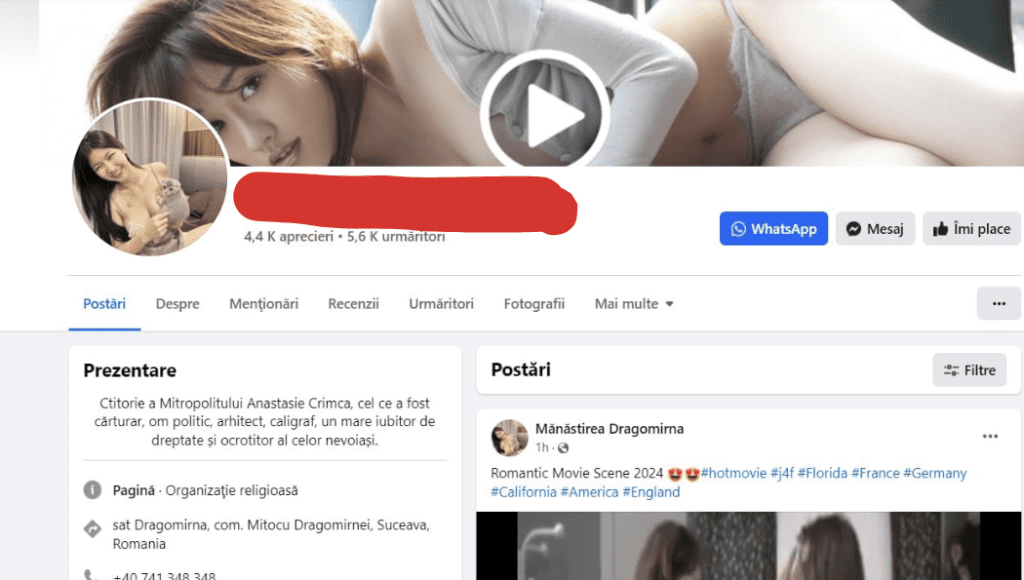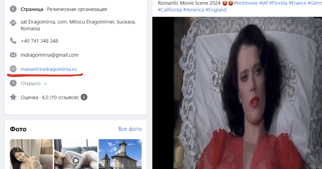 Так, на странице Mănăstirea Dragomirna мы обнаружили посты религиозного характера, а следом видео эротического содержания.
