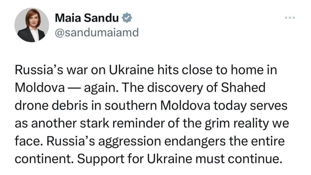 «Война России с Украиной снова подступила близко к дому в Молдове. То, что обломки беспилотника Shahed обнаружили на юге Молдовы, напоминает нам о мрачной реальности, с которой мы сталкиваемся. Агрессия России ставит под угрозу весь континент. Необходимо продолжать оказывать поддержку Украине», — написала Санду в соцсети X (ранее Twitter).