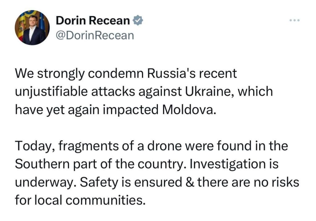 «Сегодня в южной части Молдовы были найдены фрагменты дрона. Проводится расследование. Общественная безопасность обеспечивается властями, и для местных сообществ нет никаких рисков», — написал премьер в соцсети.