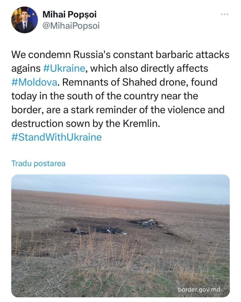 Молдавские власти осудили атаки России против Украниы. Так, президент Майя Санду, премьер-министр Дорин Речан, а также глава Министерства иностранных дел (МИД) Михай Попшой прокомментировали обнаружение обломков боевого дрона на юге Молдовы.