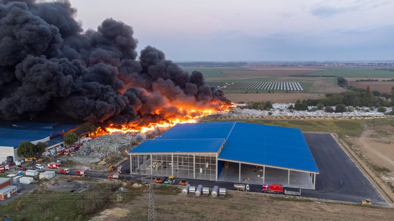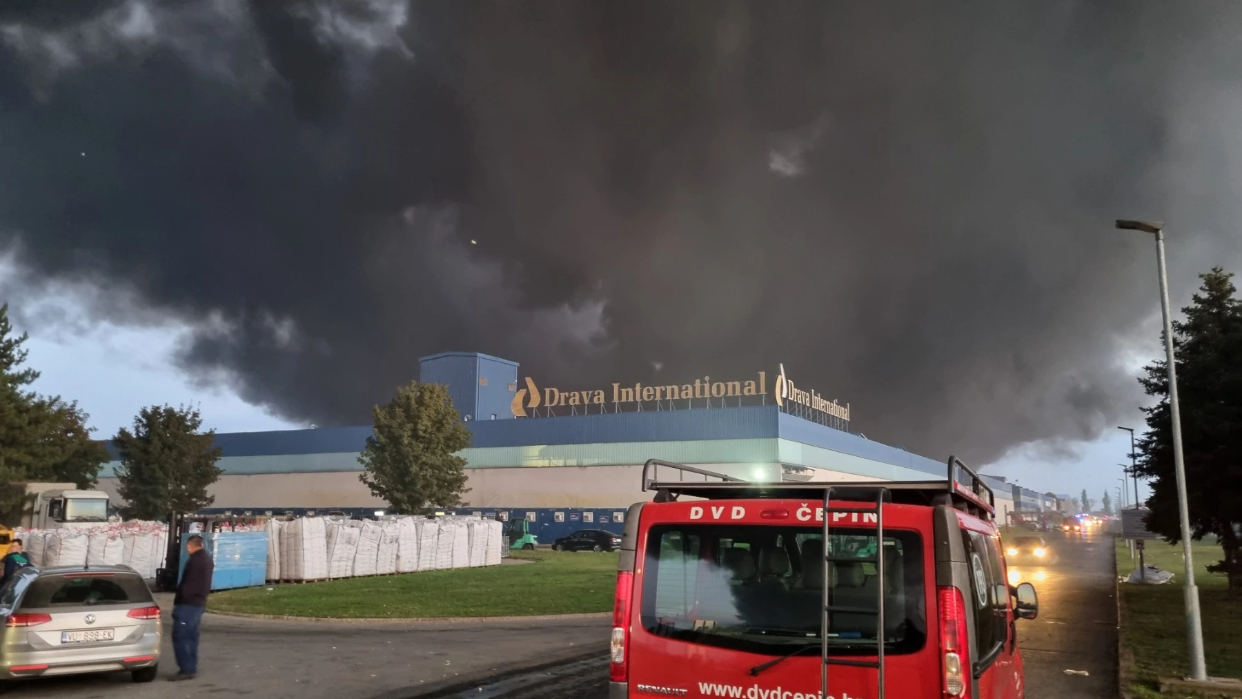 Пожар вспыхнул в среду утром на заводе Drava International в городе Осиек. Площадь возгорания быстро увеличилась, над городом возникло облако черного дыма.