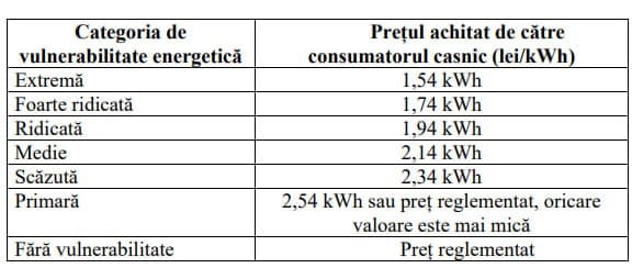 Так, потребители с крайней энергетической уязвимостью будет платить 1,54 лея за кВт/ч, с очень высокой уязвимостью — 1,74 лея, высокой — 1,94 лея, средней — 2,14 лея, низкой — 2,34 лея. Потребители с самой низкой энергетической уязвимостью и без нее будут платить 2,54 лея за кВт/ч или по установленному тарифу.