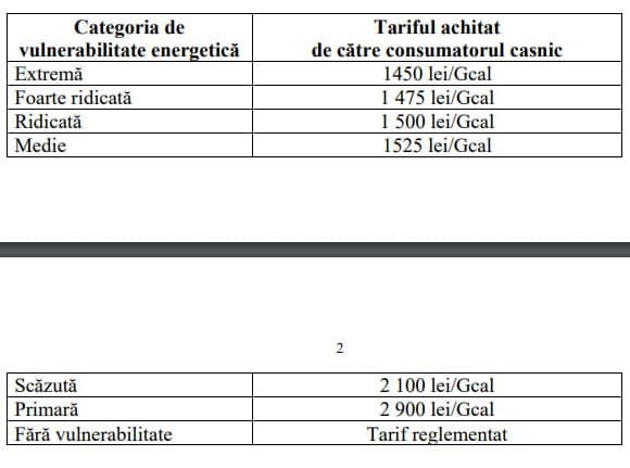 Бытовые потребители с крайней степенью уязвимости будут платить 1450 леев за Гкал, с очень высокой уязвимостью — 1475 леев за Гкал, высокой — 1500 леев за Гкал, средней — 1525 леев за Гкал, низкой — 2100 леев за Гкал, начальной энергетической уязвимостью — 2900 леев за Гкал. Для потребителей без энергетической уязвимости компенсации не предусмотрены. Они будут платить за отопление по установленному тарифу.